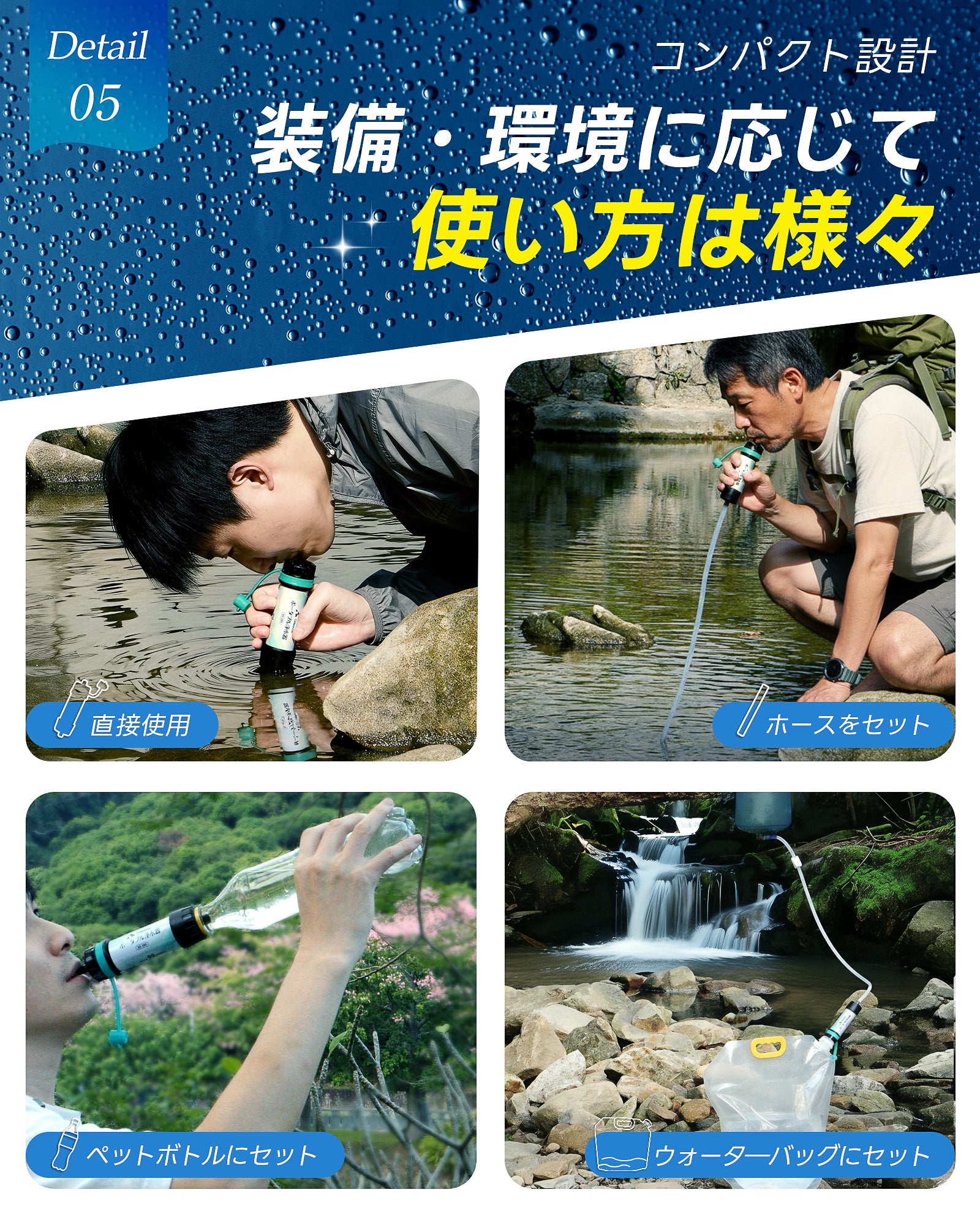 【お手入れ簡単&様々な使い方】 注射器は不要で浄水した水をバックウォッシュ(逆注入)するだけで、フィルターを清潔に保つことができます。さらに、付属のストローやウォーターバッグ、市販のペットボトル(口経28mm)と組み合わせることで、あらゆるシーンで柔軟にご利用いただけます。